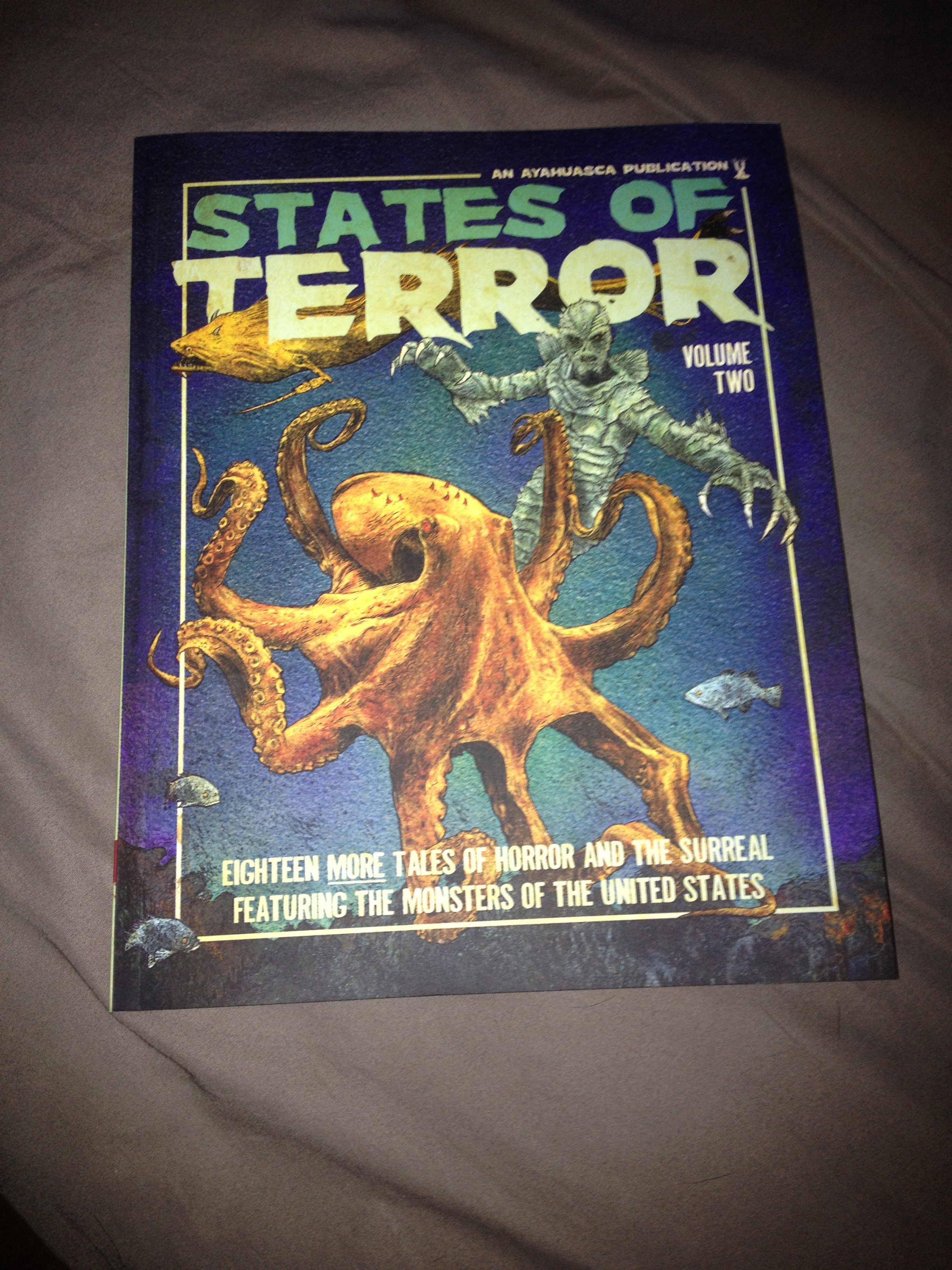 This arrived in the mail last night, just in time for All Hallow’s Eve, Dia de los Muertos and, I dunno, Shlocktober, I guess. Anyway, I’m pretty damned thrilled to be a part of this beautifully packaged anthology of stories meant to tingle yer sphincter, shock yer socks off and give you the fear-shits. Volume 2 in the Matt Lewis’ and Keith McCleary’s States of Terror series features tall tales and cruci-fictions about the ghouls, ghosts and cryptozoological monstrosities rumored to haunt these fifty United States (plus Alaska and Hawaii, I’d imagine–I haven’t read ’em all yet!). My contribution is a lurid, seriocomic tale of a land developer who runs afoul of Florida’s most famous Everglades dweller (not counting the guys on Swamp Pawn or whatever), the infamous, and notoriously stinky, Skunk Ape.